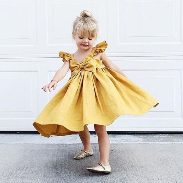Girls Simple Solid Color Bowknot Decor Dress
